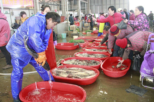 當然,節日的餐桌上也少不了蝦兵蟹將,水產區平日經營時間為凌晨12:00-6:00,春節期間,為方便市民采購,特設了白天零售專區,春節期間白蝦量大價格有所下降,對蝦因減產價格略有高,螃蟹漲價一成,淡水魚、雜魚價格平穩,走親訪友的帶魚、鯧鳊魚、黃魚等八仙過海禮盒銷量走俏。