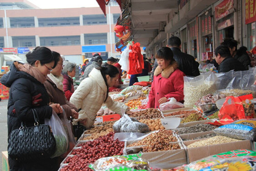 在干貨5-7號大廳經營的大部分是來自新疆、陜西、河南、河北的外地經營戶,他們鼓勵市民品嘗后再買,大而糯的駿棗、小卻瓷實的灰棗,香脆的開心果、山核桃、巴達木等各種堅果,五顏六色的年貨大禮包等讓節日充滿在喜慶和快樂中,干貨交易區元旦以來日銷量3000多噸。