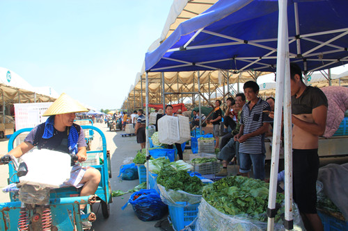 40歲的安徽人李金寶和他老婆一起在交易區賣菜,他說前年隨老鄉來到南通,在興仁包了50多畝地種植蔬菜,每天凌晨1點鐘起床,和老婆,另外請的兩個小工一起摘菜、裝筐、裝車到早晨8點鐘,然后開車40分鐘到通農物流排隊、繳費,將近九點鐘開始賣,早晨在市場里買兩個大餅就著礦泉水當早餐和中飯,下午賣得快的話兩三點鐘能賣完,最晚五點鐘收攤。他說今年氣溫特別高,夏天蔬菜不澆水要干死,白天泥土是燙的,不能給蔬菜澆水,即使晚上泥土也是熱的,給蔬菜澆水的時候,泥土上騰騰的冒熱氣,很多蔬菜差不多是被燙死的,所以產量特別低,價錢就貴,以前青菜0.2元/斤的時候,賣不出價錢,虧了,種菜賣菜也有風險,但跟以前在建筑工地做小工比,好多了,以前苦累不算,還讓家人天天擔心,現在不去建筑工地了,和老婆來南通包地一起種菜賣菜,賺多賺少,家人不用擔心,通農物流還給臨時經營戶搭建了大棚遮陽,這比在露天建筑工地做小工日子好過多了,而且通農物流還為外來經營戶子女開辦了暑期輔導班——蒲公英成長園,就在水果交易區會議室,送過去很方便。南通大學志愿者和通農物流的年輕員工義務給孩子輔導暑假作業,讓大家可以安心經營。