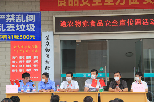 為普及食品安全有關(guān)法律法規(guī),加強(qiáng)食品安全監(jiān)管,9月25日下午,通農(nóng)物流舉辦了2020年食品安全宣傳周啟動(dòng)儀式,觀音山市場(chǎng)監(jiān)督管理局綜合科科長(zhǎng)潘韶忠、通農(nóng)物流副總經(jīng)理姜浩、邵飛參加活動(dòng)。