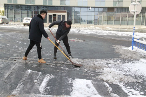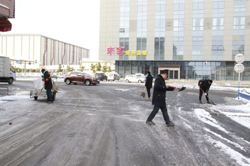 1月25日大雪過后,26日早晨道路結(jié)冰,來往市場的人流量較大。為保障前來市場采購年貨的消費者、進(jìn)貨商及在市場經(jīng)營的商戶的出行安全,干貨區(qū)安全秩序管理人員及現(xiàn)場員工在經(jīng)理助理范一凡的帶領(lǐng)下,不畏嚴(yán)寒,分片負(fù)責(zé),在5、6、7號大廳中間及兩側(cè)主干道上奮力推雪、鏟雪、掃雪。在所有人員齊心協(xié)力的共同努力下,經(jīng)過了2個多小時,主干道等重要路口的積雪被掃除,減少了意外事故的發(fā)生。(干貨部 吳珍鳳)