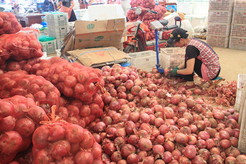 “每天有近900車左右的蔬菜運(yùn)抵,其中客菜占據(jù)蔬菜總供應(yīng)量60%以上。浙江冬瓜批發(fā)每斤0.3元,山東洋蔥每斤也不過(guò)0.6元?!弊蛱焐衔?,通農(nóng)物流蔬菜交易區(qū)里一片忙碌,相關(guān)負(fù)責(zé)人介紹,監(jiān)測(cè)數(shù)據(jù)顯示,本周蔬菜供應(yīng)量達(dá)9700噸左右,蔬菜價(jià)格整體平穩(wěn),環(huán)比上周下跌2.8%,但較去年同期上浮5.65%。目前海安東臺(tái)、內(nèi)蒙土豆、本地西紅柿、壽光雜貨、蘭州雜貨、毛豆、洋蔥、海門雜貨等蔬菜銷量靠前,價(jià)格在0.3-1.9元/斤不等。