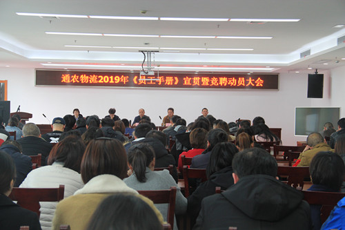 3月22日下午,通農物流在展銷樓四樓大會議室開展“安全教育培訓月”再培訓大會、2019年版《員工手冊》宣貫暨競聘動員大會,會議由通農物流副總經理闞君成主持。