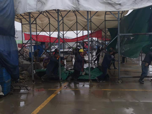 26日由水果交易區(qū)經(jīng)理帶頭,管理人員組隊,集中在南場地,移動大棚。雖然天公不作美,陰雨綿綿,但大家卻是干勁十足。帶著手套,喊著號子,發(fā)揮不怕苦、不怕累的精神,齊心協(xié)力,將十幾個大棚全部移動完畢。