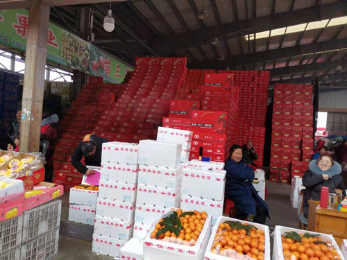 隨著春節進入倒計時,水果交易區也迎來了銷售旺季。在交易區各處,我們可以看到各個攤位前,一箱箱水果堆積如山,各個種類的水果琳瑯滿目。