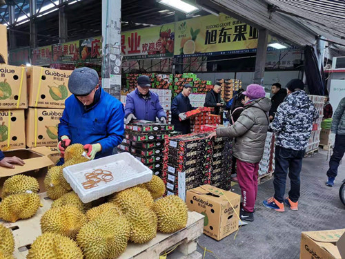 節前,除了蘋果、梨子、砂糖桔、橙子、柚子及地產草莓等一些大眾化水果銷量較好之外,國外進口的車厘子、榴蓮、山竹、金果等也較為暢銷。尤其是智利的車厘子,價格較前期空運的下降了有三成左右,價格親民,前來購買的市民較多。春節又是一個走親訪友的佳節,各種小包裝禮盒類的水果當前較為暢銷,據士廣果業的老板介紹,這幾天從各水果產地調來了五六車各種禮盒裝水果來應對節前的銷售高峰。