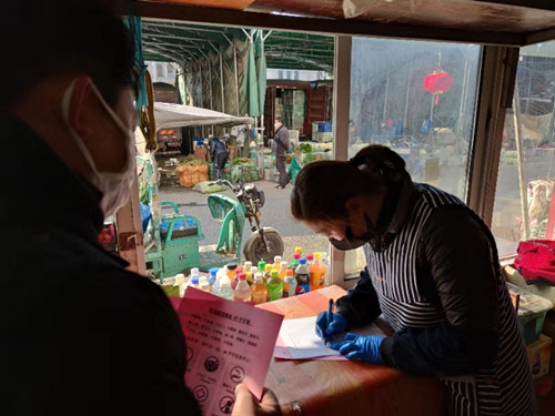 (二)全面登記。所有經(jīng)營(yíng)戶進(jìn)場(chǎng)必須測(cè)量體溫,做好人員、車(chē)輛、貨源的登記工作,所有職工上下班必須測(cè)量體溫。交易區(qū)每個(gè)大棚要有專人負(fù)責(zé),每日都要調(diào)查了解,一旦發(fā)現(xiàn)經(jīng)營(yíng)戶體溫有異常的,必須立即向安保部匯報(bào)。同時(shí),消毒工作要做到全覆蓋。