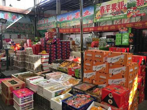 在水果交易區(qū),蘋(píng)果、橙子、柚子、獼猴桃、芒果、車(chē)?yán)遄拥鹊纫彩嵌训脻M滿當(dāng)當(dāng)。通農(nóng)物流擁有兩座四萬(wàn)噸冷庫(kù),水果倉(cāng)儲(chǔ)充足,并能滿足高質(zhì)量的保鮮要求。