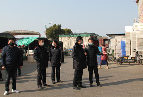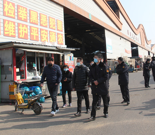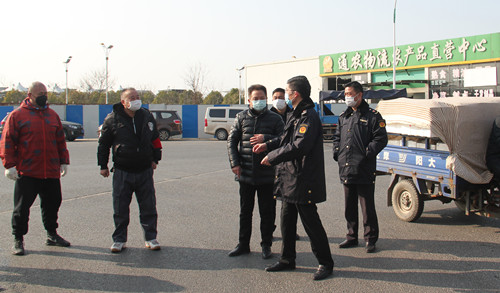通農物流總經理徐徑首先向黃局長介紹了通農物流在市場內采取的防疫手段和防疫方法,黃局長也對通農物流市場的防疫工作表達了肯定,不論是不斷循環提醒的揚聲器,還是隨處可見的指使標牌和逢車必檢的工作人員,黃局長都對通農物流接地氣的宣傳方式表示了贊賞。黃局長強調,要全面調動市場內所有的宣傳資源,一定要用經營戶們理解的通俗易懂的方式方法向他們宣傳防疫的重要性,杜絕形式主義!蔬菜區經理呂劍表示,特殊時期蔬菜區也重新安排了工作人員,在人員數量上做減法,減少人員流通,但在工作內容上做加法,人員雖然減少但絕不耽誤工作。