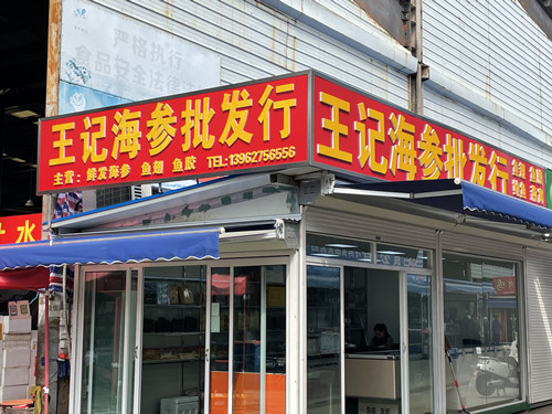 為了豐富水產肉類交易區經營品種,滿足老百姓一站式購買配套需求,方便消費者,近期水產肉類交易區水產大棚中間過道新增一家專營海參、燕窩等高端產品的店面——王記海參批發行。