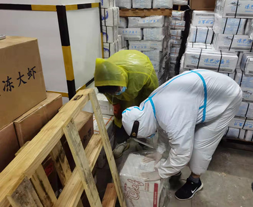 此次演練模擬了市場監督管理局檢查人員日常檢查過程中發現通農物流水產區某經營戶購進的一批南美對蝦核酸檢測為陽性。隨后立即啟動進口冷鏈食品應急處置演練預案,對涉及的經營單位開展調查,對經營區域進行管控,對包括經營戶在內的所有密切接觸者進行跟蹤管理,全力追根溯源,控制事態蔓延和發展。另外,還對該經營戶存放進口冷鏈食品的第三方冷庫進行了檢查,分別查看了該批次食品是否在江蘇冷鏈平臺規范登記,冷庫是否按要求分隔存放,進銷貨情況是否與臺賬一致等。各參演部門按照職責分工有序開展處置、溯源、流調、上報等相關工作。