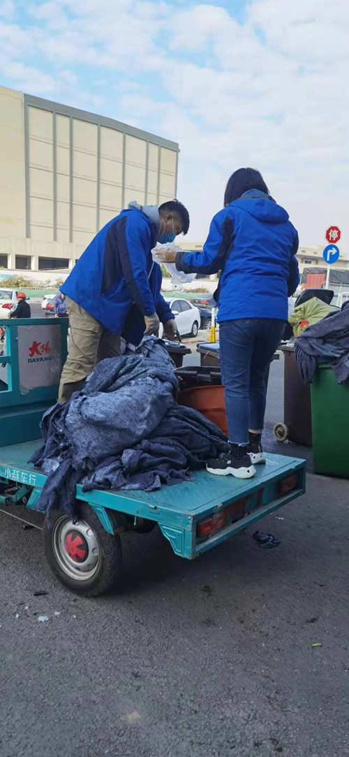 11月19日上午,商業樓保潔反映西南門出口處的垃圾桶內有丟棄的棉布,使垃圾桶負重太大,無法及時的傾倒,影響后續使用,且存在一定的安全隱患。根據文明城市創建的相關要求,干貨區立即組織人員進行清理,在干貨區管理王曉翠的帶領下大家戴上手套,擼起袖子,齊心協力將棉布從垃圾桶里取出,用三輪車運到糧油后場地等待處理。
