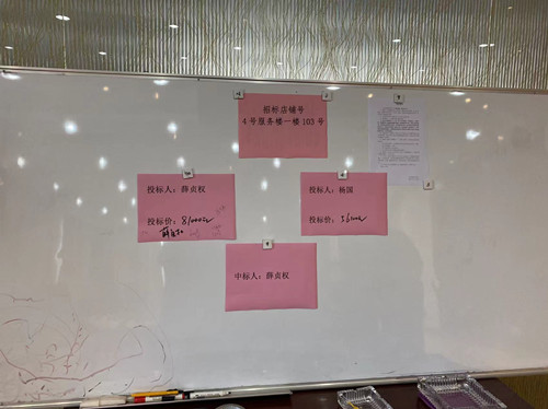招標會議上,干貨交易區副經理顧志勇首先詳細介紹了本次招標會的要求、參與招標會的工作人員及關于招標會議的紀律等情況,簡要介紹了該空置店鋪的房屋結構、面積及地理位置等基本概況,由參與本次競標的客戶在投標須知上簽字確認收回后發放報價單開始填寫各自報價;開標前,由監標人何岸芷確定各競標人員的報價單完好無損后當眾拆封,唱標人吳珍鳳唱標,記標人王曉翠在白板上進行記錄,經過公示確定最終中標人,并由參與此次招標會議的人員在中標書上逐一簽字確認,保證了本次競標活動的公平公正。