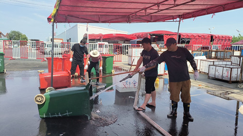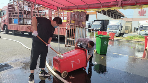 進入夏季,垃圾桶里的垃圾極易發生腐敗變質,加之各類瓜果大量上市,蚊蠅進入繁殖期,藏污納垢的垃圾桶嚴重影響交易區內的環境衛生。為提升市場環境質量,解決場內垃圾桶表面臟污、氣味難聞等問題。近日水果區班組成員及安全管理人員對交易區內的垃圾桶進行了清洗。