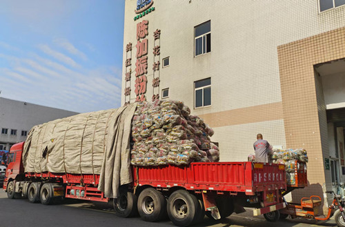 11月30日,在通農物流干貨交易區5號大廳南側,一車杏花村牌精品紅薯粉絲正在卸貨,杏花村牌的紅薯粉絲以鮮薯為原料,久煮不糊,清香可口,可搭配多種食材烹飪。