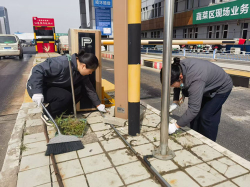 近日,蔬菜區收費崗亭黨員示范崗的員工們開展了一次周邊環境衛生集中整治行動。