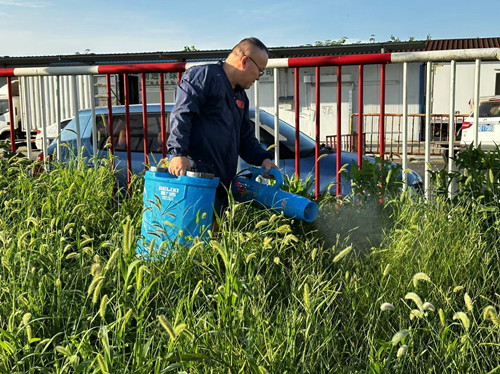 盡管正值高溫酷暑時節,水果區業務經營主管陳躍華毫不畏懼,主動清除雜草。只見他手持噴霧器,一絲不茍地進行細致噴灑,確保不遺漏任何一個角落。汗水如同斷了線的珠子,不斷從他的額頭滑落,浸濕了衣服,但他依然堅持不懈地工作著,毫無懈怠。